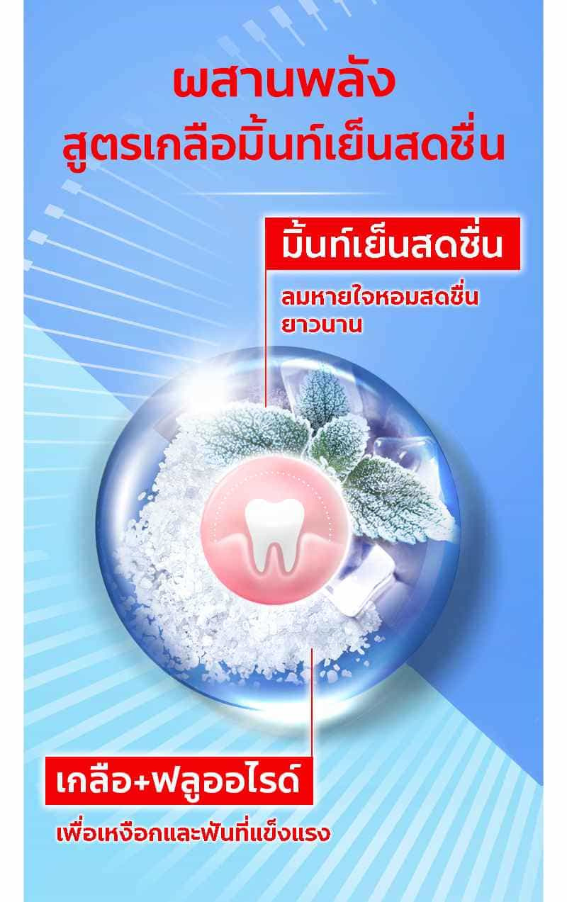 - คอลเกต ยาสีฟันเกลือเฟรชมัลติวิตามิน มัลติ-วิตามิน สูตรเกลือเฟรชที่มีวิตามินซีและอี ช่วยลดการสะสมของแบคทีเรีย