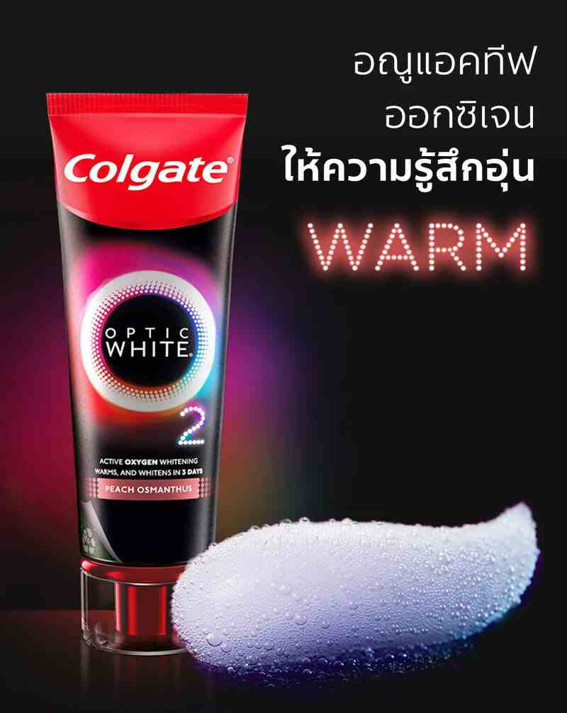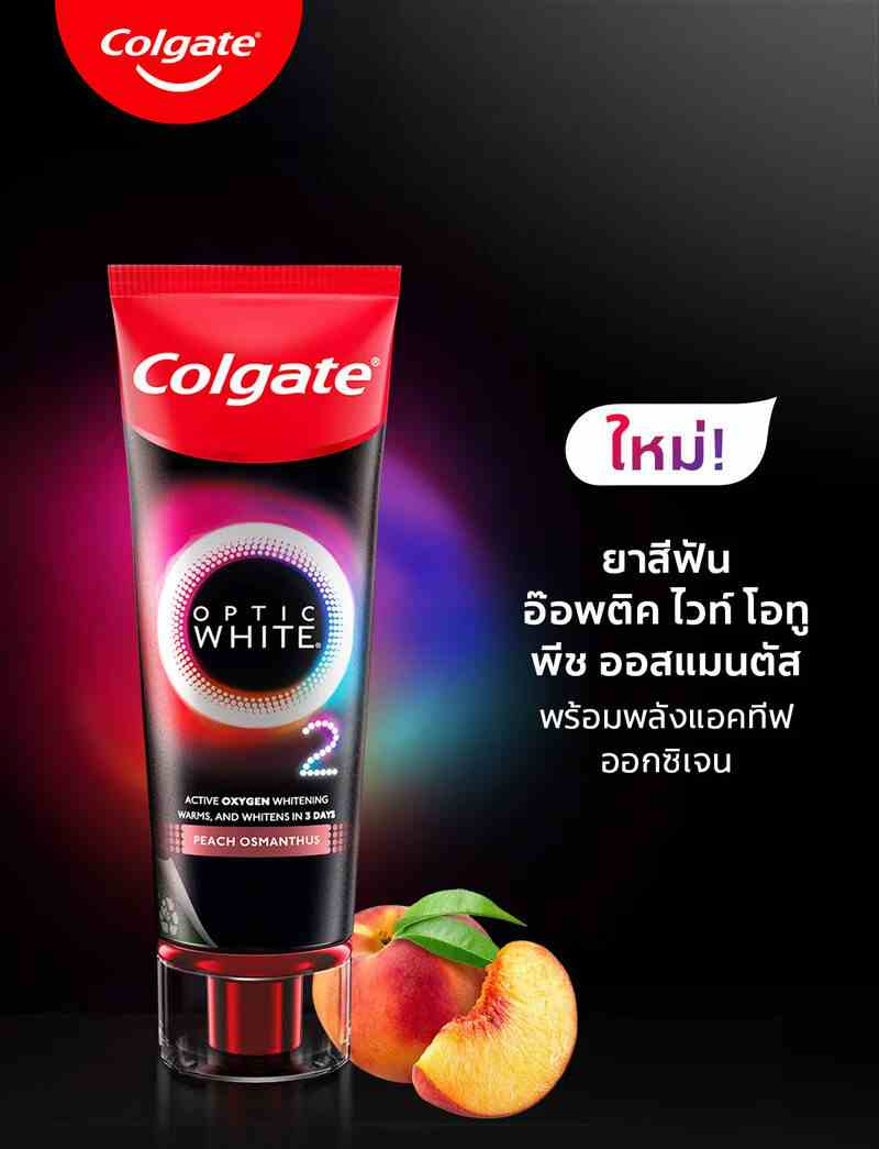 ยาสีฟันคอลเกต อ๊อฟติค ไวท์ โอทู พีช ออสแมนตัส ช่วยขจัดคราบเหลืองบนผิวฟัน ให้ฟันขาวอย่างเป็นธรรมชาติหลังใช้ 1 สัปดาห์