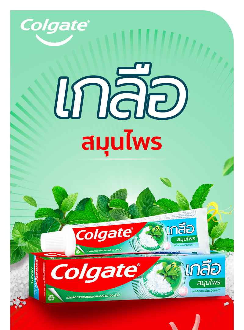 - คอลเกตเกลือสมุนไพรมีเกลือและสมุนไพรผสานเข้ากับแคลเซียมและฟลูออไรด์เพื่อการปกป้องอย่างครบสูตร
