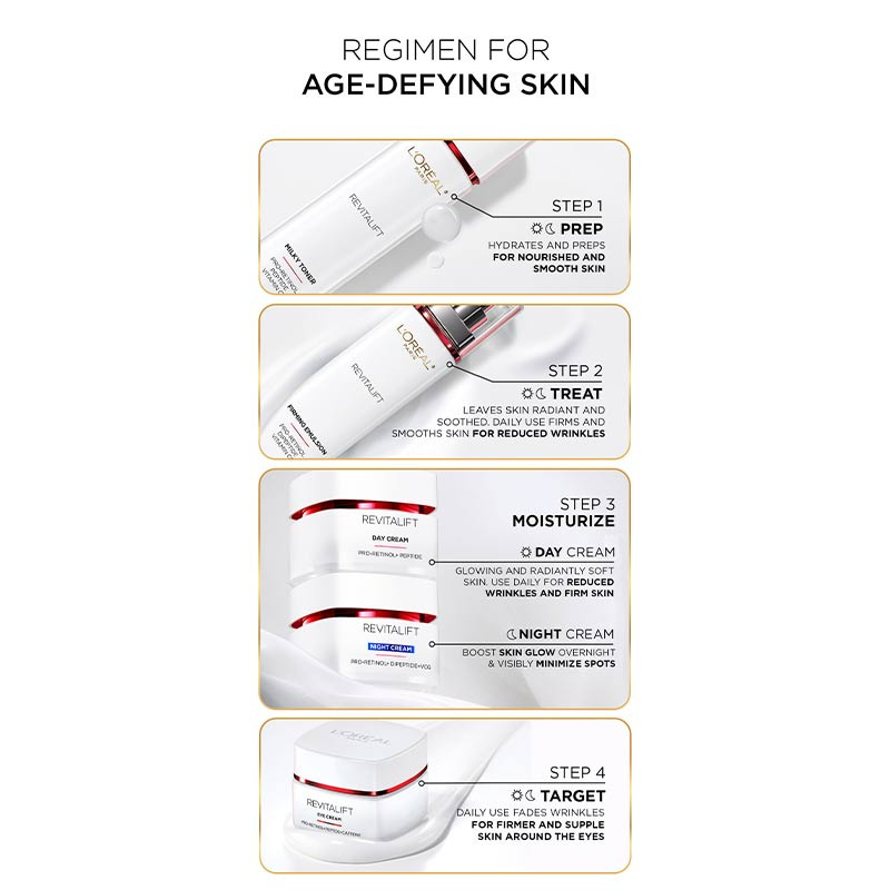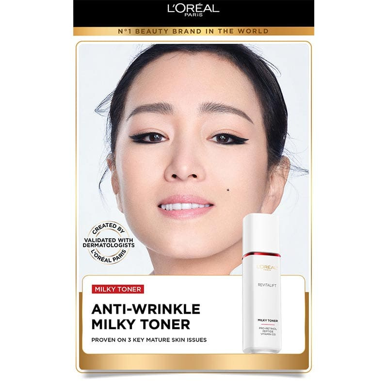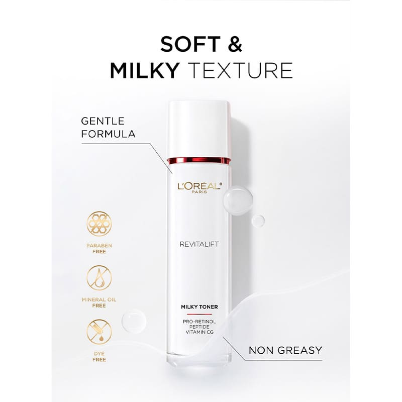 ลอรีอัล รีไวทัลลิฟท์ แอดวานซ์ อะควา มิลค์กี้ โทนเนอร์ 65 มล. โทนเนอร์เนื้อน้ำนมสูตรอ่อนโยน ช่วยปลอบประโลมผิว เติมความชุ่มชื้นทันทีหลังล้างหน้า พร้อมเตรียมผิวให้พร้อมรับการบำรุงในขั้นตอนถัดไป ผสาน Pro-Retinol A และ Centella Asiatica ให้ผิวดูอิ่มฟู กระชับ เรียบเนียน เหมาะสำหรับทุกสภาพผิว