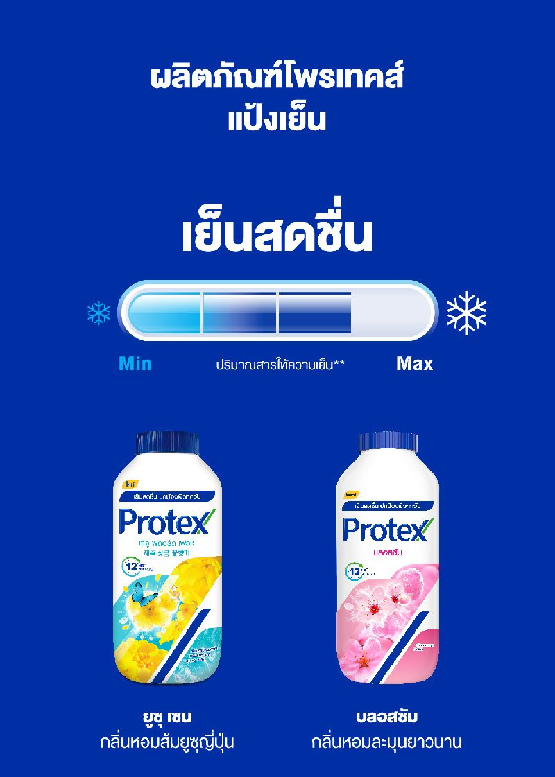 สดชื่นเย็นมั่นใจตลอดวัน ด้วยแป้งเย็น โพรเทคส์ เพรช ช่วยป้องกันผดคื่นคันและการระคายเคืองของผิว มีกลิ่นหอมเย็นสดชื่น