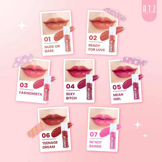 A.T.Z Wonder Me Kiss & Shy Lip ลิปทินท์กึ่งแมตต์ เม็ดสีชัด ติดทน ให้สีสันสวยงามพร้อมบำรุงริมฝีปาก มีสารสกัดจากน้ำกุหลาบ วิตามินซี อี และบี3