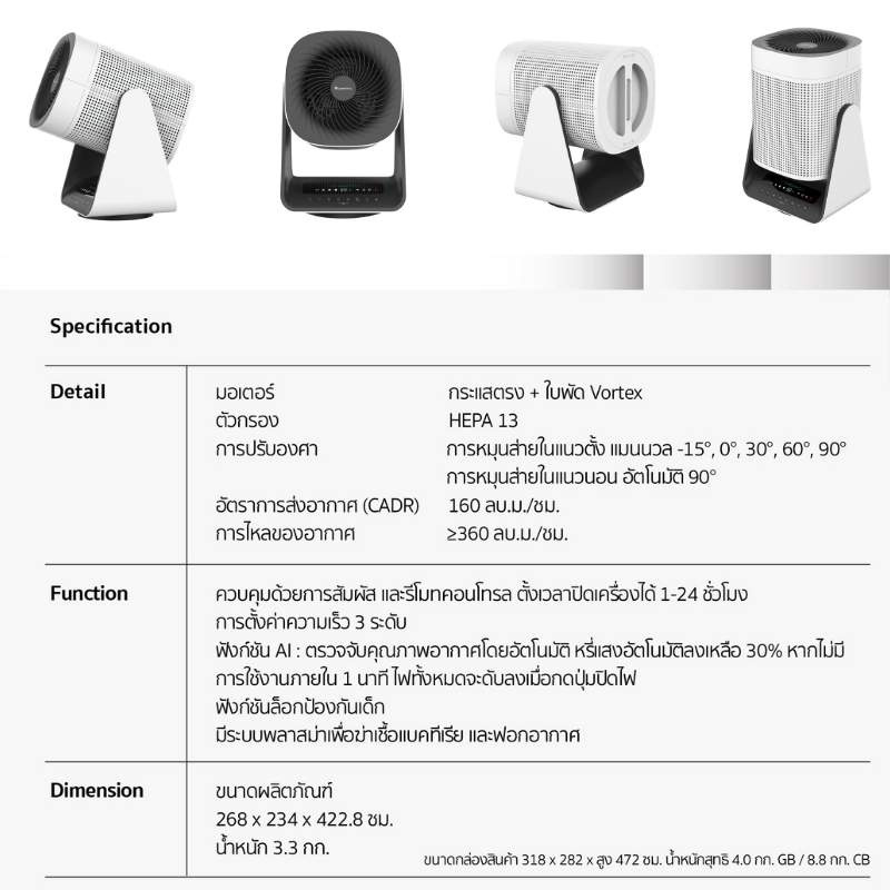 การควบคุม: สามารถควบคุมได้ 2 รูปแบบ คือ ปุ่มสัมผัส (Touch Control) และ รีโมทคอนโทรลการตั้งเวลา: ตั้งเวลาเปิด/ปิด ได้ตั้งแต่ 1 – 24 ชั่วโมงระดับการทำงาน: สามารถปรับความแรงลมได้ 3 ระดับระบบ AI อัจฉริยะ:ปรับความแรงลมอัตโนมัติ (Auto Mode)ลดแรงลมลง $30\%$ เมื่อตรวจจับว่าไม่มีฝุ่นฟังก์ชัน Ionizer: สร้างประจุลบเพื่อ กำจัดเชื้อแบคทีเรีย และฟอกอากาศให้บริสุทธิ์ยิ่งขึ้นฟังก์ชัน Child Lock: ล็อคปุ่มควบคุม ป้องกันเด็ก มาปรับการทำงานของเครื่อง