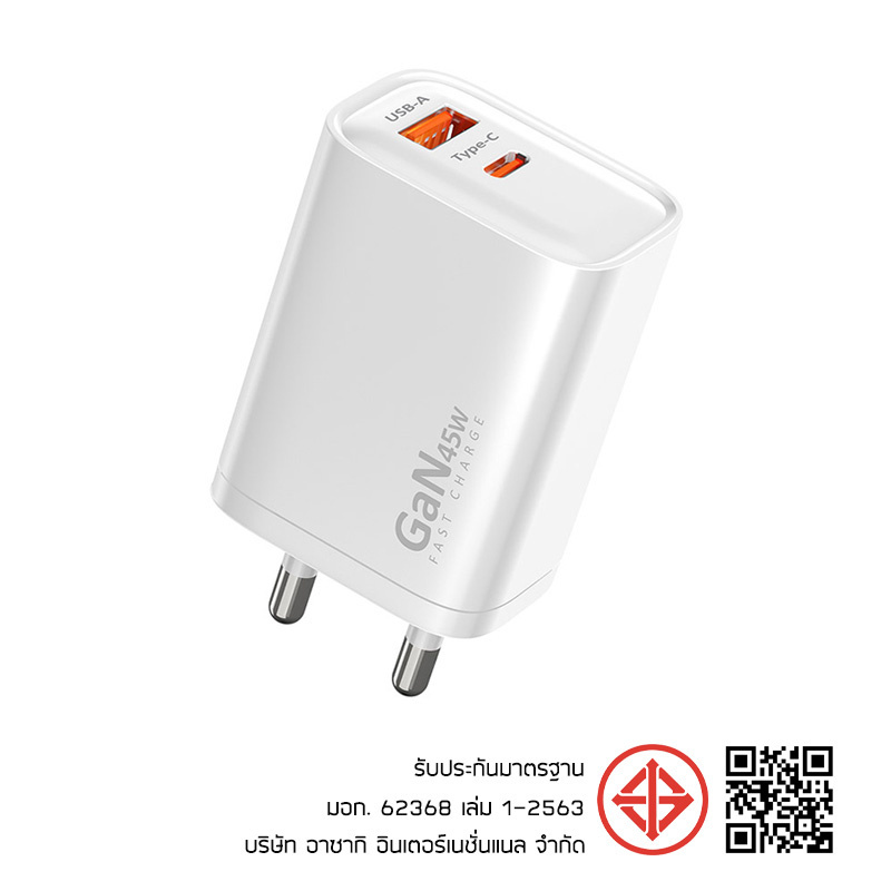 อะแดปเตอร์ 45W อุปกรณ์ชาร์จไฟอเนกประสงค์ อะแดปเตอร์(AC) 2 ช่องชาร์จ Type-C และ USB-A สามารถชาร์จไฟบ้านได้ด้วยกำลังไฟสูงสุด 45W(3A) เทคโนโลยี GaN รองรับการชาร์จด่วน