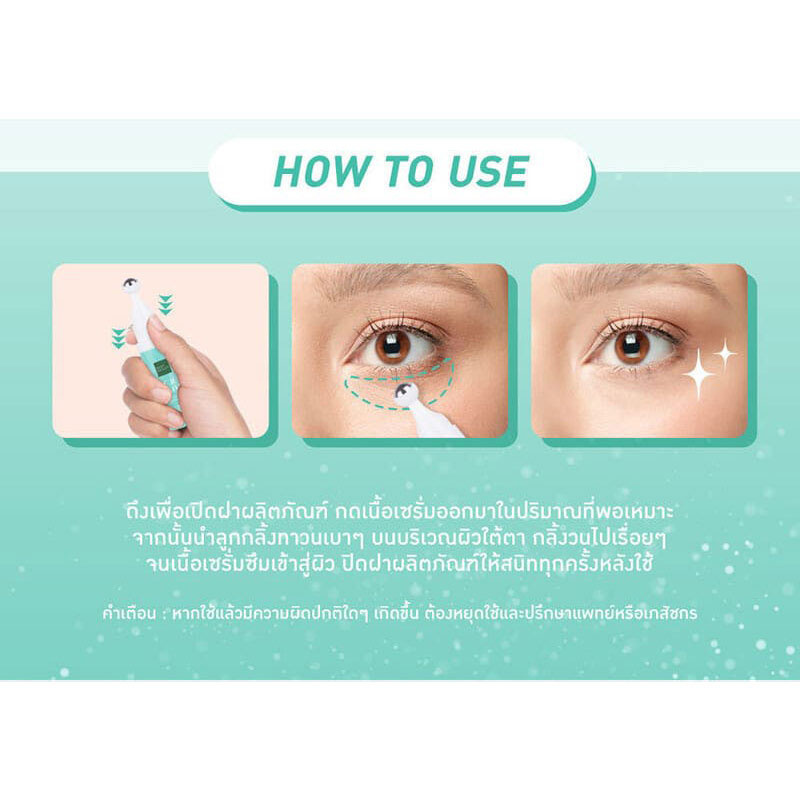 ดึงเพื่อเปิดฝาผลิตภัณฑ์ กดเนื้อเซรั่มออกมาในปริมาณที่พอเหมาะ จากนั้นนำลูกกลิ้งทาวนเบาๆ บนบริเวณผิวใต้ตา กลิ้งวนไปเรื่อยๆ จนเนื้อเซรั่มซึมเข้าสู่ผิว ปิดฝาผลิตภัณฑ์ให้สนิททุกครั้งหลังใช้