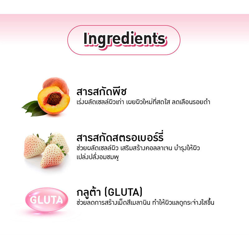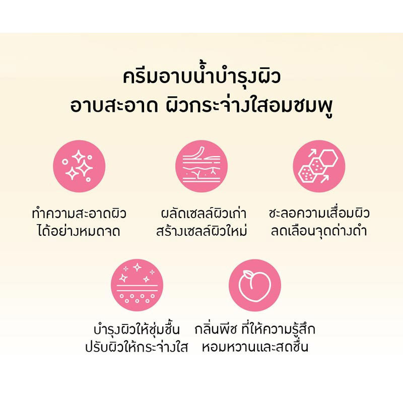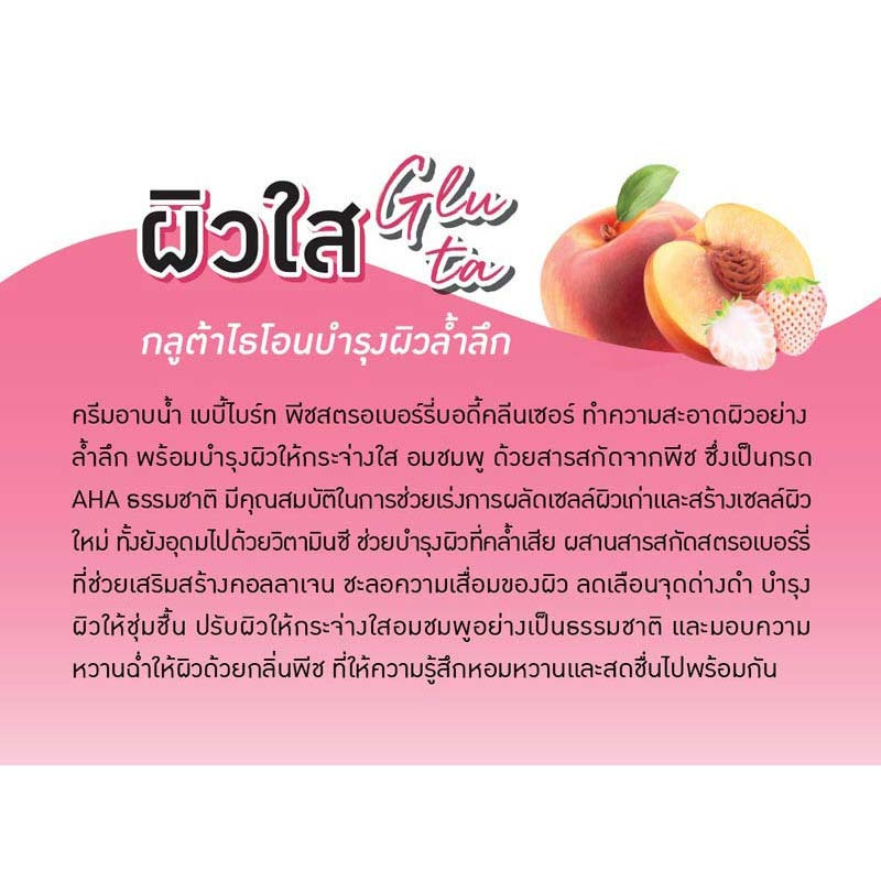 ครีมอาบน้ำ เบบี้ไบร์ท พีชสตรอเบอร์รี่บอดี้คลีนเซอร์ ทำความสะอาดผิวอย่างล้ำลึก พร้อมบำรุงผิวให้กระจ่างใส อมชมพู ด้วยสารสกัดจากพีช ซึ่งเป็นกรด AHA ธรรมชาติ มีคุณสมบัติในการช่วยเร่งการผลัดเซลล์ผิวเก่าและสร้างเซลล์ผิวใหม่ ทั้งยังอุดมไปด้วยวิตามินซี ช่วยบำรุงผิวที่คล้ำเสีย ผสานสารสกัดสตรอเบอร์รี่ ที่ช่วยเสริมสร้างคอลลาเจน ชะลอความเสื่อมของผิว ลดเลือนจุดด่างดำ บำรุงผิวให้ชุ่มชื้น ปรับผิวให้กระจ่างใสอมชมพูอย่างเป็นธรรมชาติ และมอบความหวานฉ่ำให้ผิวด้วยกลิ่นพีช ที่ให้ความรู้สึกหอมหวานและสดชื่นไปพร้อมกัน