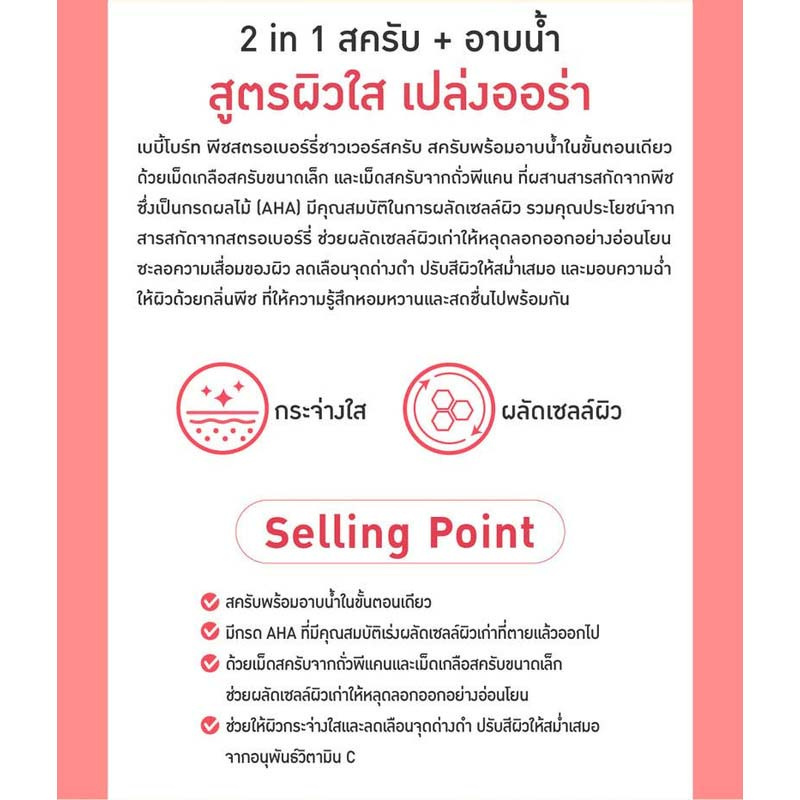 เบบี้ไบร์ท พีชสตรอเบอร์รี่ชาวเวอร์สครับ สครับพร้อมอาบน้ำในขั้นตอนเดียว ด้วยเม็ดเกลือสครับขนาดเล็กและเม็ดสครับจากถั่วพีแคน ที่ผสานสารสกัดจากพีช ซึ่งเป็นกรดผลไม้ (AHA) มีคุณสมบัติในการผลัดเซลล์ผิว รวมคุณประโยชน์จากสารสกัดจากสตรอเบอร์รี่ ช่วยผลัดเซลล์ผิวเก่าให้หลุดลอกออกอย่างอ่อนโยน ชะลอความเสื่อมของผิว ลดเลือดจุดด่างดำ ปรับสีผิวให้สม่ำเสมอ และมอบความฉ่ำให้ผิวด้วยกลิ่นพีช ที่ให้ความรู้สึกหอมหวานและสดชื่นไปพร้อมกัน