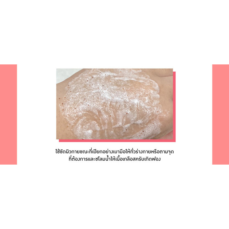 บีบเนื้อสครับออกมาในปริมาณที่พอเหมาะ ขัดผิวกายขณะผิวเปียกอย่างเบามือให้ทั่วร่างกายหรือตามจุดที่ต้องการ และชโลมน้ำให้เนื้อเกลือสครับเกิดฟอง ใช้ทำความสะอาดผิว จากนั้นล้างออกด้วยน้ำสะอาด ปิดฝาผลิตภัณฑ์ให้สนิททุกครั้งหลังใช้ ควรใช้เป็นประจำ สัปดาห์ละ 2-3 ครั้ง