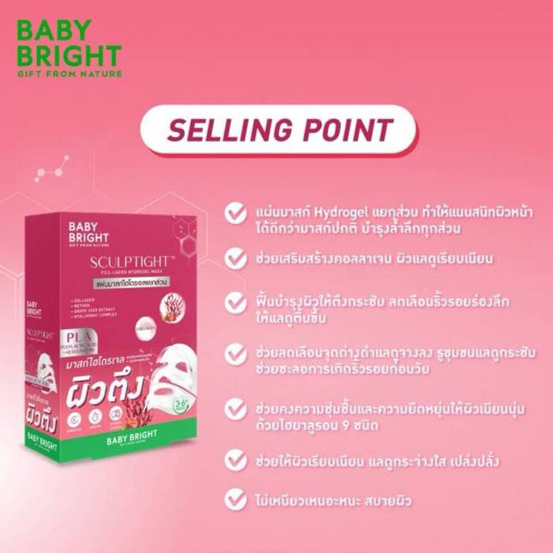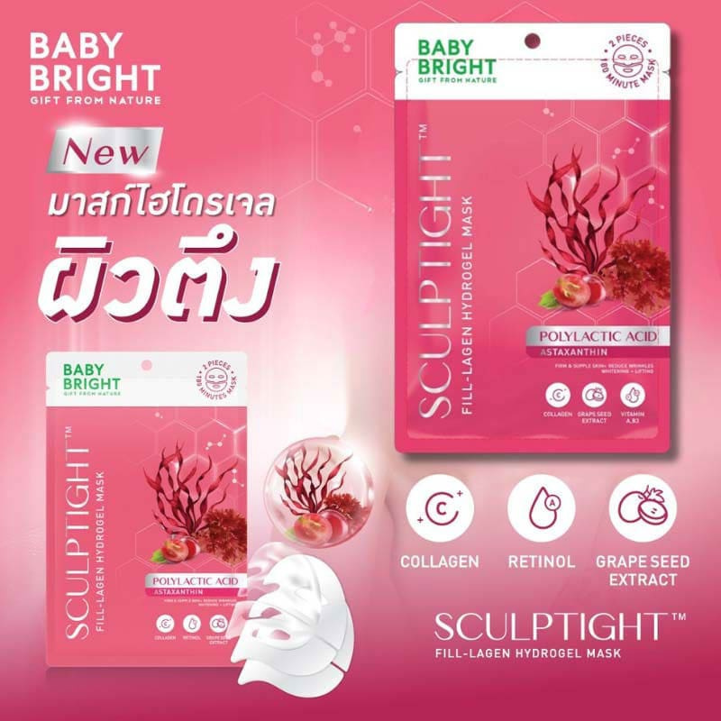 Baby Bright Sculpttight Fill-Lagen Hydrogel Mask เป็นแผ่นมาส์กไฮโดรเจลที่ออกแบบมาเพื่อฟื้นบำรุงผิวให้ตึงกระชับและดูอ่อนเยาว์ มาพร้อมเทคโนโลยี Sculpttight ที่ช่วยเติมเต็มคอลลาเจนในผิวได้อย่างล้ำลึกด้วยสารสกัดจาก Polylactic Acid ที่ช่วยกระตุ้นการผลิตคอลลาเจนให้ผิวดูเรียบเนียนและกระชับขึ้น โดยมี Astaxanthin (สารสกัดจากสาหร่ายสีแดง) ที่ช่วยบำรุงผิวและลดเลือนริ้วรอยให้แลดูตื้นขึ้น ทำให้ผิวดูอ่อนเยาว์และมีความกระชับอย่างเป็นธรรมชาติ