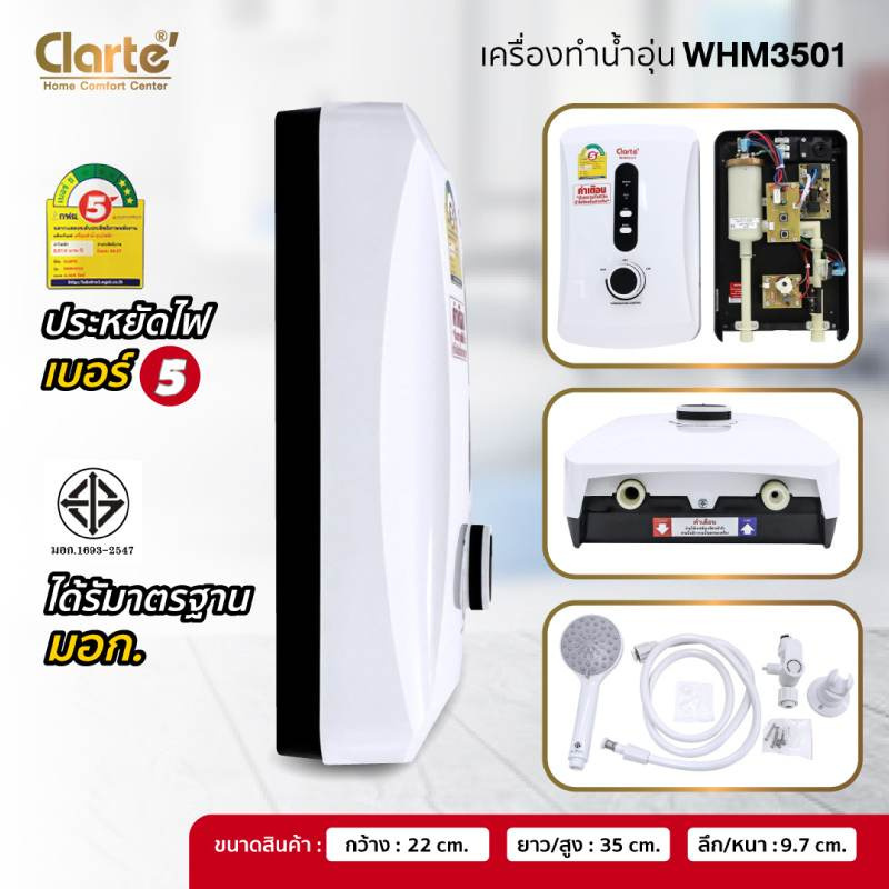 - ได้รับมาตรฐาน มอก.1693-2547 สำหรับตัวเครื่อง และ มอก.2066-2552 สำหรับฝักบัว