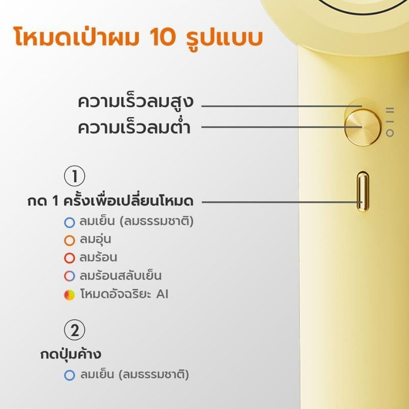 1. ลมแรง เป่าแห้งเร็ว: ขับเคลื่อนด้วยมอเตอร์แกนกลาง 110,000 รอบต่อนาที ความเร็วลมสูงสุด 66 เมตรต่อวินาที