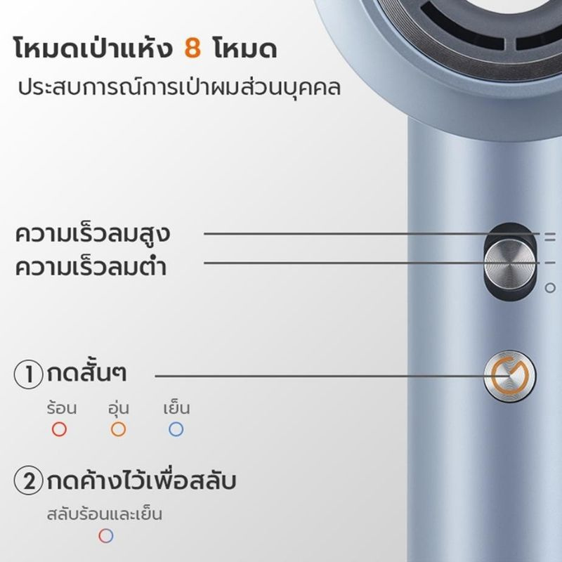 7. การตั้งค่าโหมดการอบแห้งที่แตกต่างกัน 8 โหมดเพื่อประสบการณ์การอบแห้งแบบเฉพาะตัว(แรงลม 2 ระดับ อุณหภูมิ 4 ระดับ )