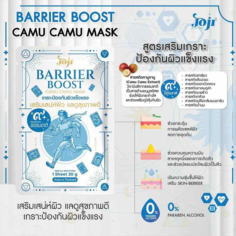 ผลติภัณฑ์ดูแลผิวหน้า แผ่นมาสก์ บำรุงผิวหน้า สูตรเสริมเกราะป้องกันผิวแข็งแรง ด้วยยคุณค่าจากสารสกัด คามูคามูที่เป็นวิตามินซีจากธรรมชาติ ผสานสารสกัดกจากธรรมชาติอีก8 ชนิด ช่วยผลัดเซลล์ผิวอย่างอ่อนโยน ลดผิวอุดตัน ควบคุมความมันส่วนเกิน