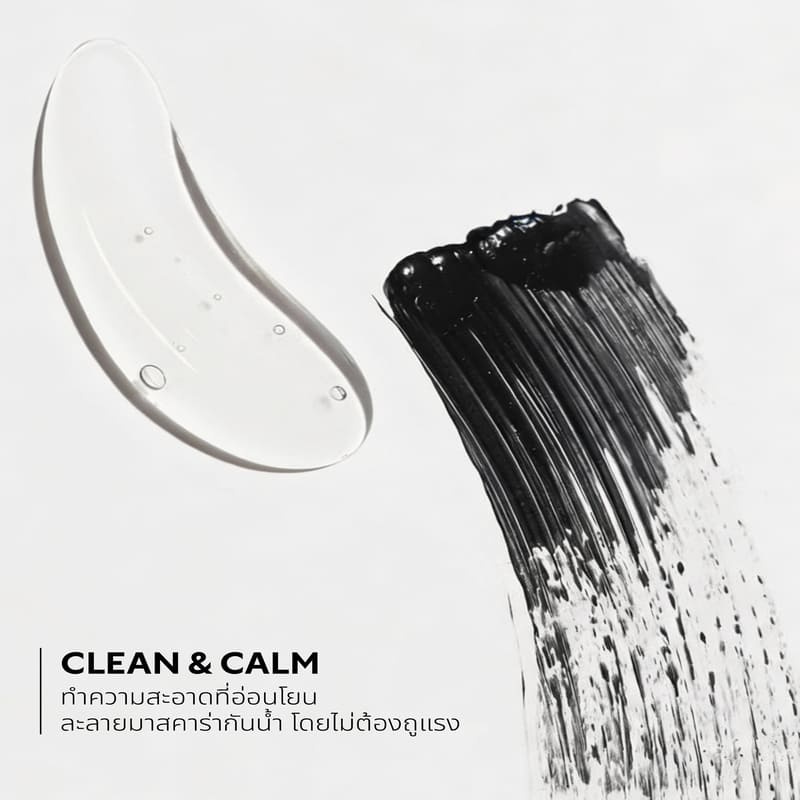 Clean & Calm การทำความสะอาดที่อ่อนโยนแต่ทรงพลังช่วยละลายมาสคาร่ากันน้ำและเมคอัพติดทน โดยไม่ต้องถูแรง พร้อมลดแรงเสียดสีรอบ ดวงตา ทำให้ผิวไม่ระคายเคืองหรือแสบตา