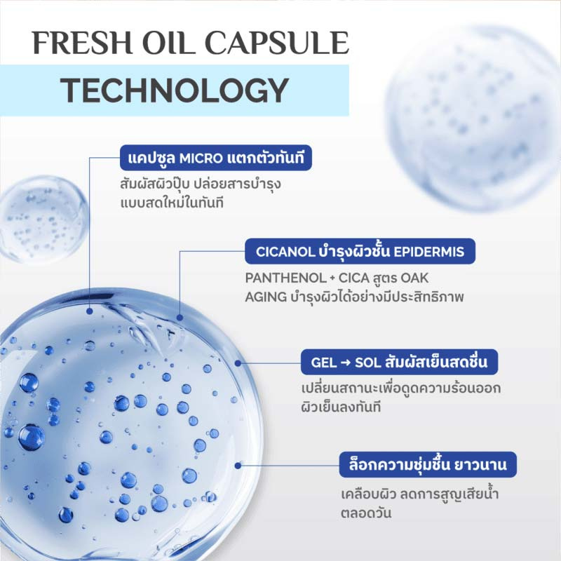 -ด้วย Fresh Oil Capsule Technology แคปซูลน้ำมันขนาด micro ที่แตกตัวทันทีเมื่อสัมผัสผิว ช่วยล็อกความชุ่มชื้น ลดการสูญเสียน้ำ และทำให้ผิวเย็นสดชื่น