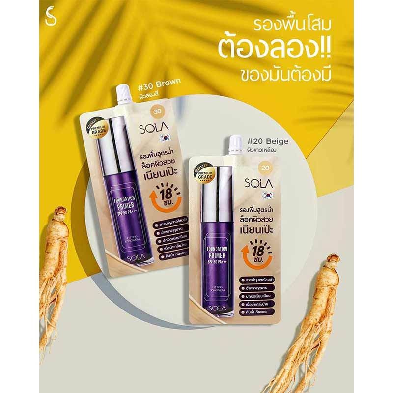 รองพื้นโสมโซลา สูตรน้ำ เกลี่ยง่าย กันแดด พร้อมสารบำรุงผิวจากโสมดำ บำรุงพร้อมเผยผิวสวยในคราวเดียว คุณค่าที่สาวๆคู่ควร ตัวเดียวจบ สวยครบในซองเดียว สุดยอดรองพื้นโสมโซลา ทั้งปกปิด ทั้งบำรุง แถมกันแดดสูง ให้การปกปิดเรียบเนียนเป็นธรรมชาติ เพิ่มความมั่นใจในทุกสถานการณ์ เนื้อแมตต์ แห้งสบายผิว ให้ผิวคุณได้หายใจ ไม่อุดตัน ด้วยเทคโนโลยีล่าสุดจาก KN Lab เม็ดสีแน่น ไม่เปลี่ยนสี ไม่ดรอประหว่างวัน พร้อมส่วนประกอบซิลิกาที่ช่วยดูดซับน้ำมันส่วนเกิน ให้ผิวแมตต์ตลอดวัน กันน้ำ กันเหงื่อ ให้คุณหมดกังวลเรื่องเป็นคราบระหว่างวันมีสารสกัดโสมดำเกาหลี และกระตุ้นการสร้างคลอลาเจนใต้ชั้นผิว ให้ผิวคุณดูอ่อนเยาว์ พร้อมกันแดดสูง SPF50PA+++ ที่ช่วยปกป้องผิวคุณจากรังสี UVA และ UVB