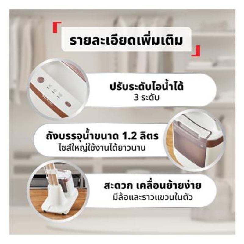 ไอน้ำที่ทรงพลังช่วยลดกลิ่นไม่พึงประสงค์ และยับยั้งไวรัสและแบคทีเรียได้ถึง 99.9% สามารถนำไปรีดกำจัดกลิ่นอับและยับยั้งแบคทีเรียบนผ้าม่าน ปลอกหมอน โซฟา ดีต่อเด็กๆและทุกคนในบ้าน