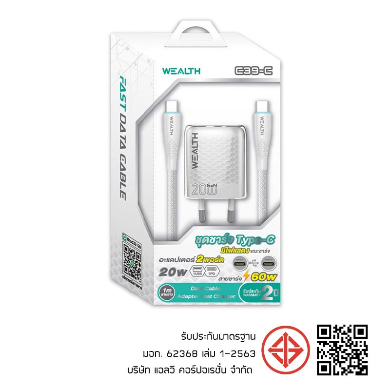 - สายชาร์จ Type-C to Type-C กำลังไฟสูงสุด 60W ยาว 1 เมตร