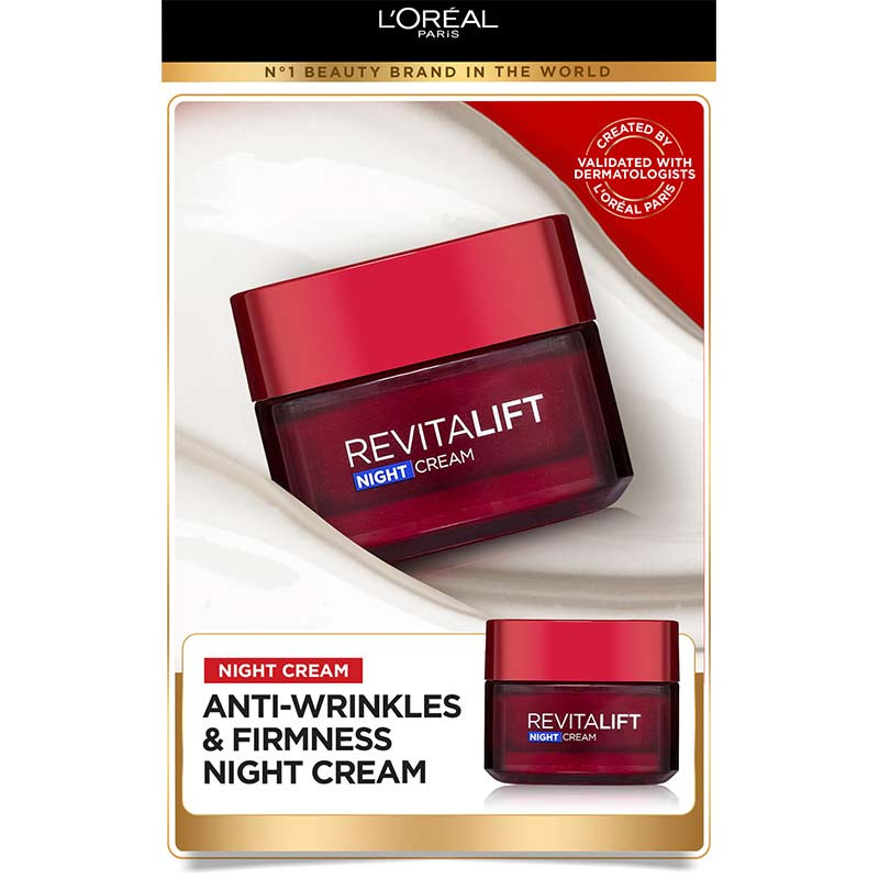 ในการบำรุงผิวตอนกลางคืน เพื่อช่วยฟื้นบำรุงสุขภาพผิวให้ดูเด้งเต่งตึง รูขุมขนกระชับ ริ้วรอยแห่งวัยดูลดเลือนลง ปิดท้ายด้วย ลอรีอัล ปารีส