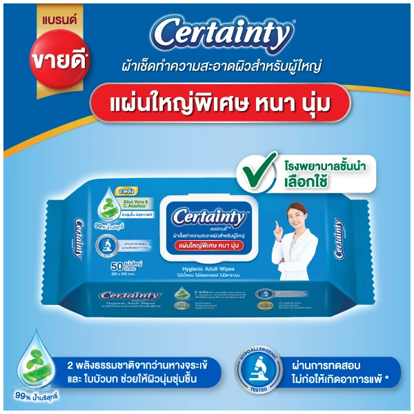 เซอร์เทนตี้ ผ้าเช็ดทำความสะอาดผิวสำหรับผู้ใหญ่ 50 แผ่น