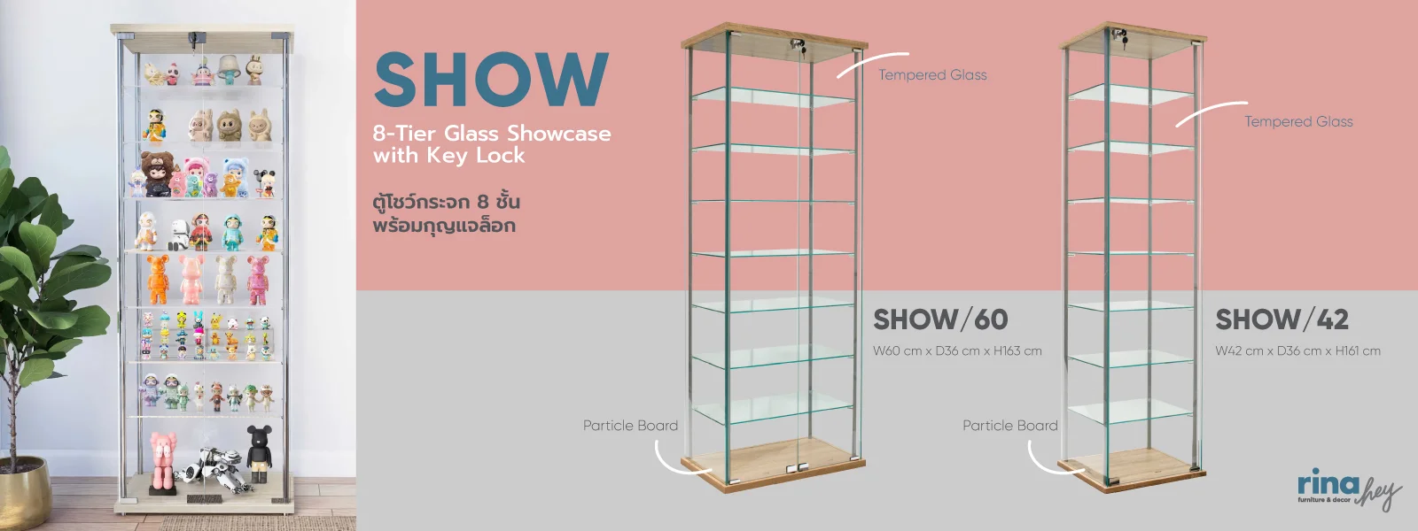 Rina Hey ตู้โชว์กระจก 8 ชั้นพร้อมกุญแจล็อก SHOW/42 ไม้ธรรมชาติ