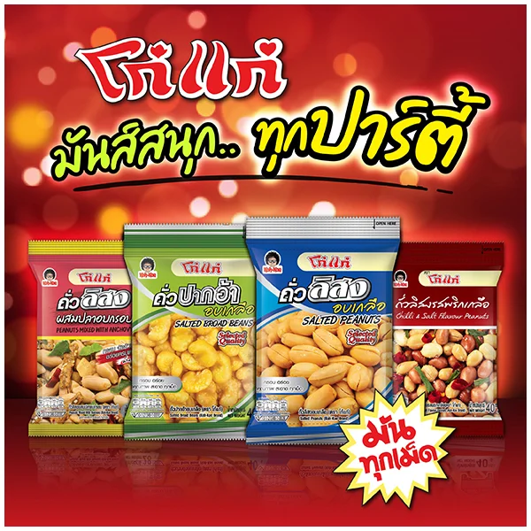 โก๋แก่เป็นแบรนด์ถั่วลิสงอบกรอบและขนมขบเคี้ยวที่ได้รับความนิยมในประเทศไทยมาอย่างยาวนาน มีผลิตภัณฑ์หลากหลายรสชาติและรูปแบบให้เลือกสรร ดังนี้