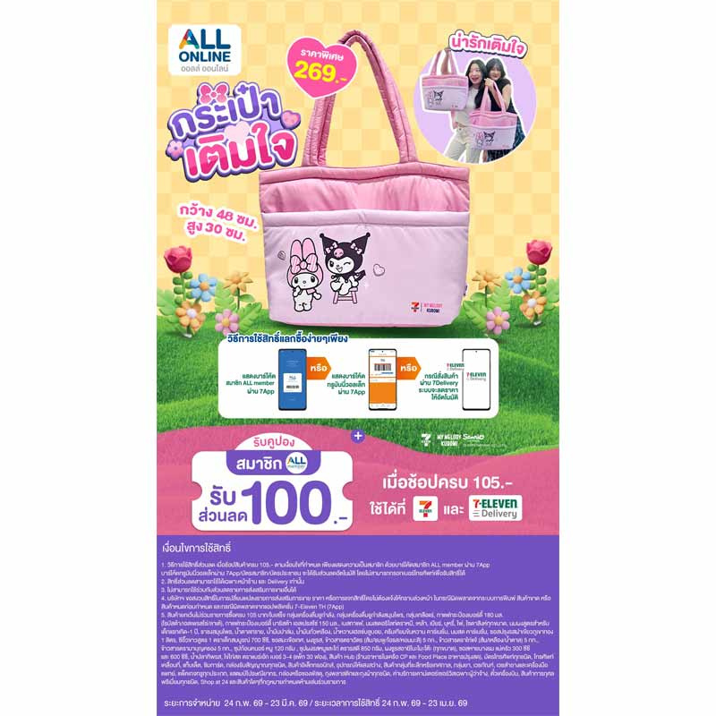 ในกระเป๋ามีบาร์โค้ด Go Green สามารถนำถุงผ้ามาใช้ที่หน้าร้าน 7-11 รับ 100 คะแนน เพียงสแกนบาร์โค้ด (จำกัด 10 สิทธิ์/สมาชิก/รอบโปรโมชั่น)