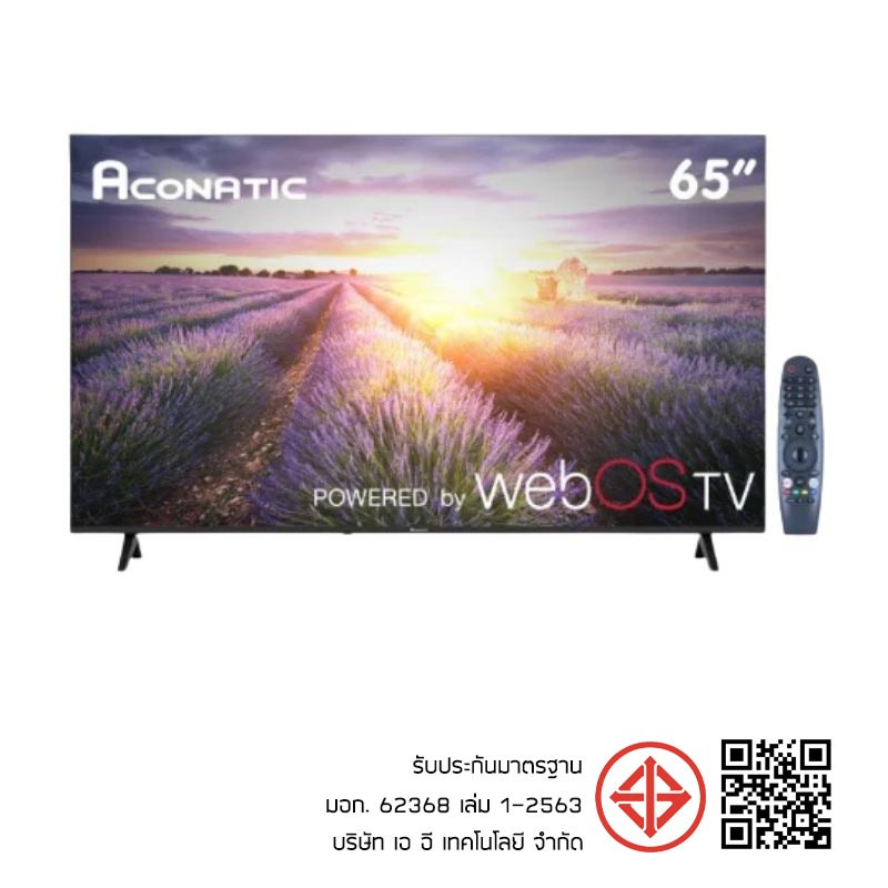 ทีวี UHD LED จาก ACONATIC ขนาดหน้าจอ 65 นิ้ว ความละเอียดคมชัดระดับ Ultra HD 4K เทคโนโลยี 4K ทำให้ภาพมีรายละเอียดที่คมชัดกว่า Full HD ถึง 4 เท่า ทำให้คุณได้สัมผัสประสบการณ์การรับชมที่สมจริง เทคโนโลยี HDR10/HLG แสดงภาพ HDR แม่นยำ ไล่เฉดสี ปรับระดับความสว่าง และความมืดได้ดีกว่าทีวีปกติ ระบบปฎิบัติการ WebOS TV Version Wee 2.0 ใช้งานง่าย ฟีเจอร์เยอะ แชร์ข้อมูลได้สะดวก อัตราการรีเฟรช 60Hz ทำให้ภาพเคลื่อนไหวดูราบรื่นและลดอาการภาพแตกหรือกระตุก TruMotion แสดงผลเนื้อหาที่เคลื่อนไหวรวดเร็วได้อย่างราบรื่น และชัดเจนยิ่งขึ้น Real Cinema ปรับอัตราส่วนเฟรมให้ความรู้สึกเหมือนอยู่ในโรงภาพยนตร์ Magic Remote อิสระต่อการควบคุมหน้าจอด้วยรีโมต Miracast และ Screen Cast แชร์รูปภาพ และวีดีโอ จากโทรศัพท์มือถือขึ้นจอทีวีได้ง่าย Voice Control รองรับการสั่งการทีวีด้วยเสียงทั้งภาษาไทยและภาษาอังกฤษ เสียงคมชัดระดับโรงภาพยนตร์ด้วยเทคโนโลยี Dolby อัปเกรดเฟิร์มแวร์อัตโนมัติ ผ่านระบบ OTA เพื่อให้สมาร์ตทีวีทันสมัยอยู่ตลอดเวลา ช่องต่อ HDMI 3, USB 2, AV in, RJ45, TV (RF), Optical, Earphone out, Bluetooth