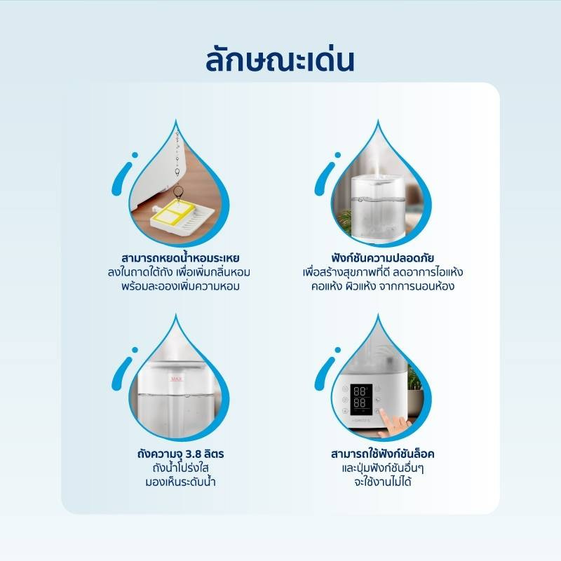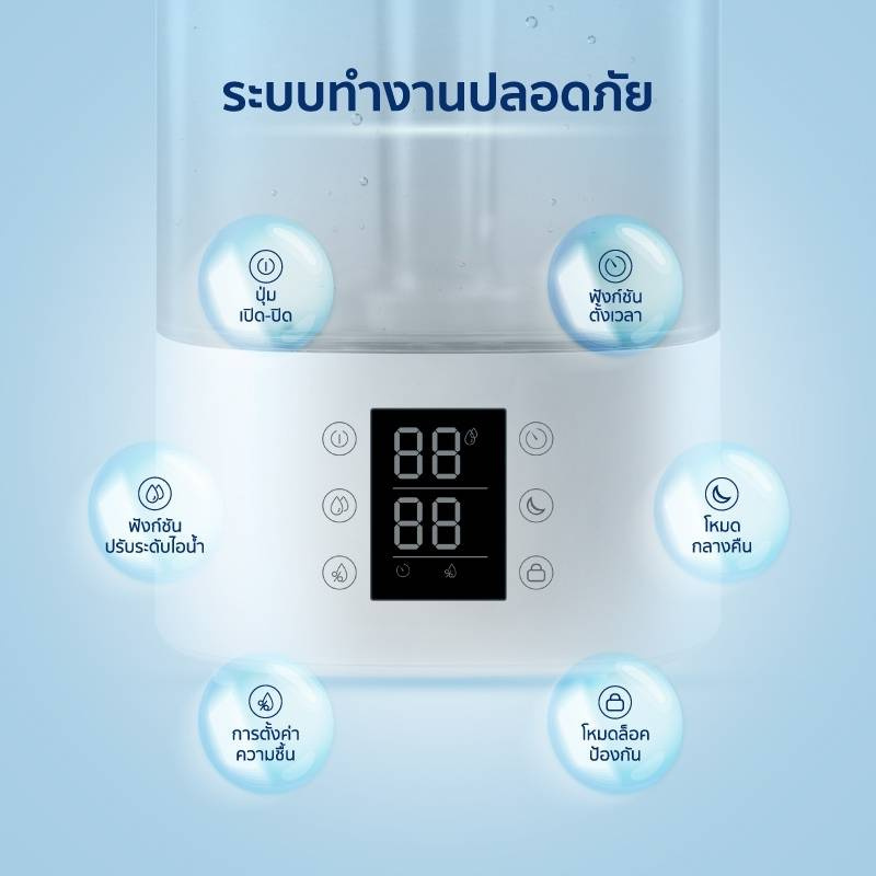 เครื่องทำความชื้น ดีต่อสุขภาพ ลดอาการไอแห้ง คอแห้ง ผิวแห้ง จากการนอนในห้องแอร์ อีก 1 สาเหตุของการไม่สบาย มีฟังก์ชันความปลอดภัย เครื่องทำความชื้นจะปิดโดยอัตโนมัติเมื่อน้ำหมด การทำงานเสียงต่ำกว่า 35dB ให้เงียบในระหว่างการใช้งานและความสะดวกสบายในการหายใจของคุณและนอนหลับ สามารถตั้งเวลาได้ตั้งแต่ 1 ถึง 12 ชั่วโมง ถังน้ำจุได้ถึง 3.8 ลิตร หน้าจอดิจิตอล LED สามารถแจ้งให้คุณทราบถึงห้องอุณหภูมิและสภาพการทำงาน ตัวเรื่องมีโหมดล็อคป้องกัน เมื่อใช้งานฟังก์ชัน ปุ่มฟังก์ชันอื่นๆจะใช้งานไม่ได้