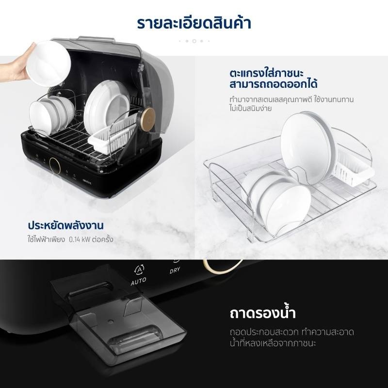 ฟังก์ชันการทำงาน : ฆ่าเชื้อด้วย UV, อบลมร้อนที่อุณหภูมิสูงและปานกลาง