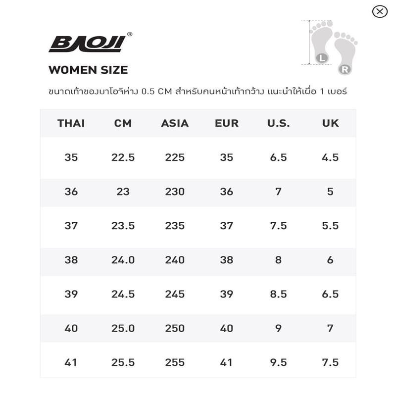 ** สำหรับคนหน้าเท้ากว้างแนะนำให้บวกเผื่อ 1 ไซส์ เพื่อความสบายบริเวณหน้าเท้า **