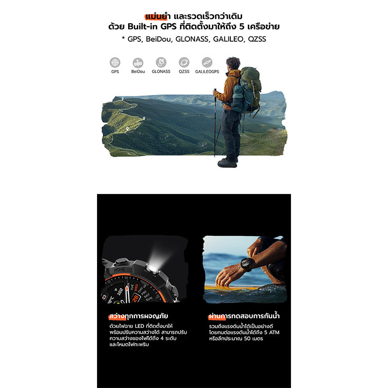 ทนทานต่อแรงดันน้ำได้ถึง 5 ATM หรือประมาณ 50 เมตร