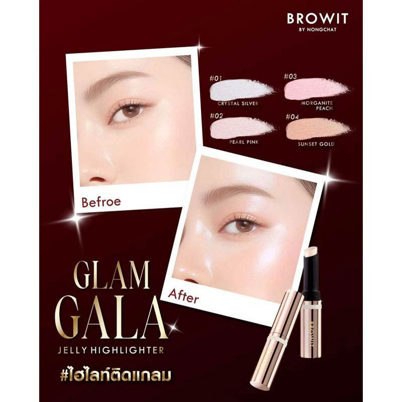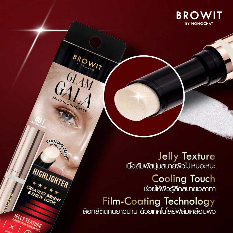 เนรมิตผิวหน้าให้โดดเด่นด้วยไฮไลท์เจลลี่แบบแท่ง เนื้อสัมผัสนุ่มเด้ง บางเบา เกลี่ยง่ายสบายผิว เพิ่มความฉ่ำโกลว์เป็นประกายระยิบระยับ เสริมลุคให้โดดเด่นมีมิติ ติดทนยาวนานด้วยเทคโนโลยีฟิล์มเคลือบสุดล้ำช่วยล็อกชั้นประกายมุกและชิมเมอร์ มอบความเปล่งประกายยาวนาน ไม่ซีดจาง ผสานสารสกัดจากไข่มุกดำ ไฮยา และไกลโคเจน ช่วยให้ผิวชุ่มชื้นอิ่มฟู กระจ่างใสเรียบเนียน สามารถทาได้ทั้งก่อนและหลังแต่งหน้า ไม่ทิ้งคราบหรือรบกวนเมคอัพ