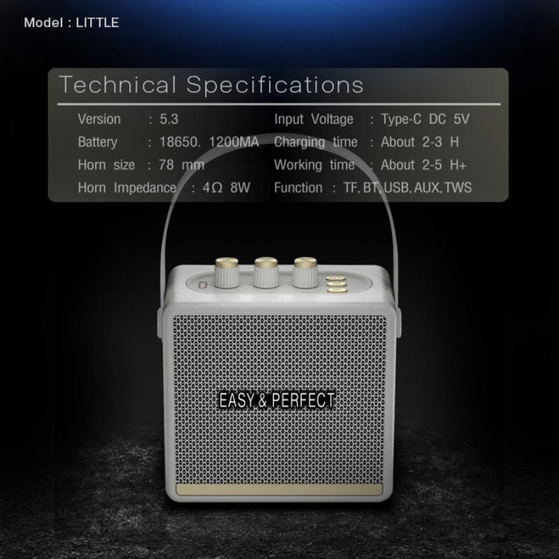 Version 5.3 Horn size 78mm Horn Impedance 4 8w Function TF,USB,TWS,GRB,BT Battery 18650 1200MA Voltage Type-C DC 5v Charging time 2-3h Working time 2-5h+