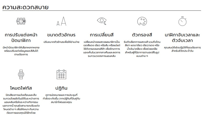 อายุแบตเตอรี่ โหมดสมาร์ทวอทช์ สูงสุด 12 วัน การแสดงผลแบบเปิดตลอดเวลา 4 วัน