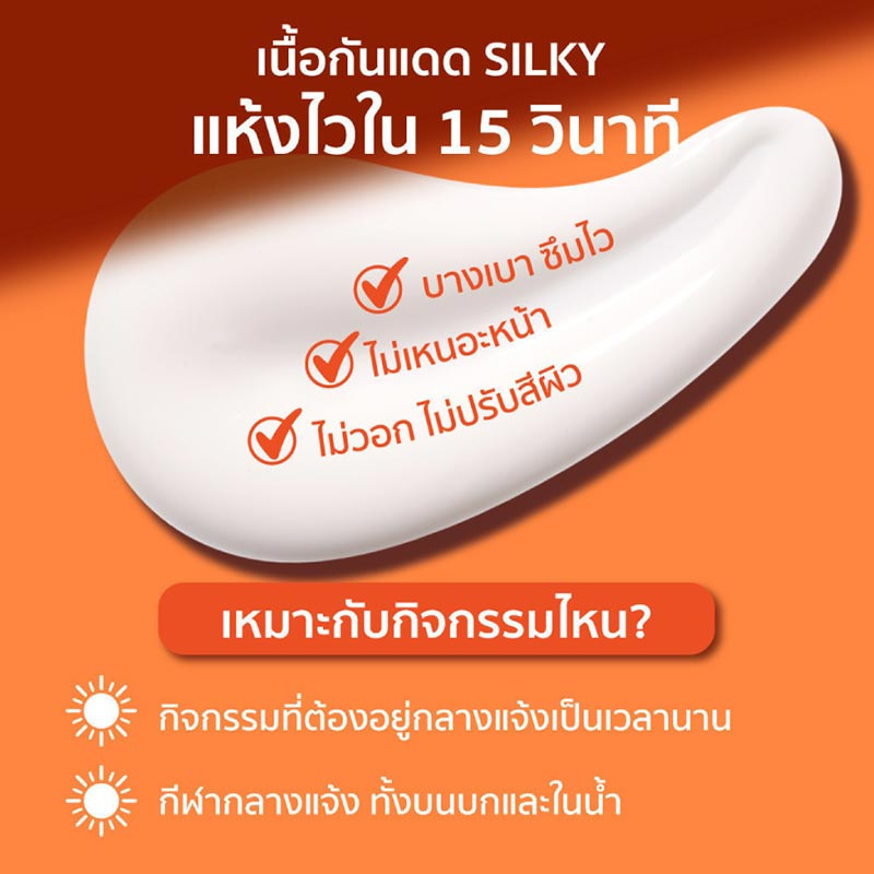 - เนื้อ Silky แห้งไวใน 15 วินาที ไม่เหนียวเหนอะหนะ สบายผิว ไม่มัน ไม่กวนเมคอัพ