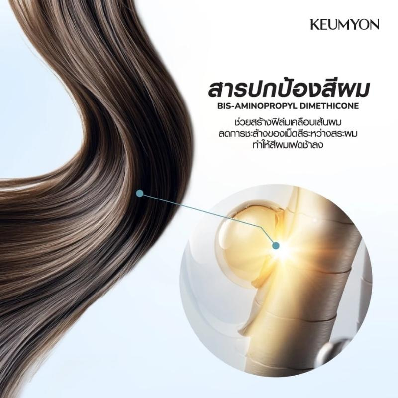 ฟื้นบำรุงผมทำสีด้วย กึมยอน คัลเลอร์รีแพร์แฮร์ทรีตเมนต์ ทรีตเมนต์สำหรับผมทำสีโดยเฉพาะ ด้วยเคราติน (Keratin) ซึ่งเป็นโปรตีนชนิดเดียวกันกับเส้นผม ช่วยบำรุงล้ำลึก ฟื้นบำรุงผมแห้งเสียจากการทำเคมี ไบโอติน (Biotin) และวิตามินบี5 (Vitamin B5) ช่วยให้เส้นผมมีความเงางาม ดูสุขภาพดี และลดปัญหาผมแห้งเสีย พร้อมเติมความชุ่มชื้นให้เส้นผมด้วยไฮยาลูรอน 4 ชนิด (4 Types of Hyaluronic acid) ช่วยให้เส้นผมเก็บกักความชุ่มชื้นได้นานขึ้น ทั้งยังมีน้ำมันธรรมชาติจากพืช 4 ชนิด (4X Essential Oil Complex) คือ น้ำมันอาร์แกน (Argan Oil) น้ำมันแมคคาเดเมีย (Macadamia Oil) น้ำมันมะพร้าว (Coconut Oil) และเชียบัตเตอร์ (Shea Butter) ช่วยให้ผมนุ่มลื่น เงางาม มีน้ำหนักอย่างเป็นธรรมชาติ พร้อมปกป้องสีผมให้ติดทนนานยิ่งขึ้น