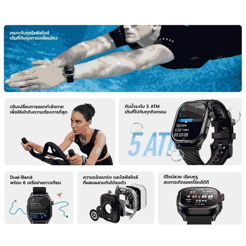 - เต็มที่ไปกับทุกจังหวะของชีวิต รองรับมาตรฐานการกันน้ำในระดับ 5 ATM
