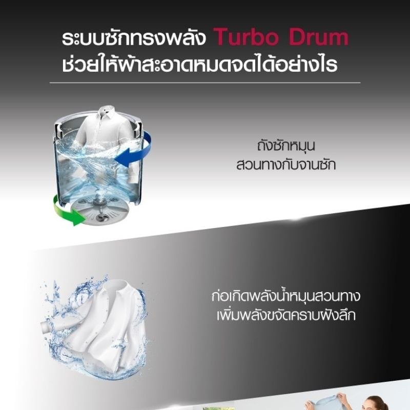 Turbo Drum พลังน้ำวนจากการหมุนสวนทางของถังและจานซัก ช่วยขจัดคราบฝังลึกได้สะอาดหมดจด