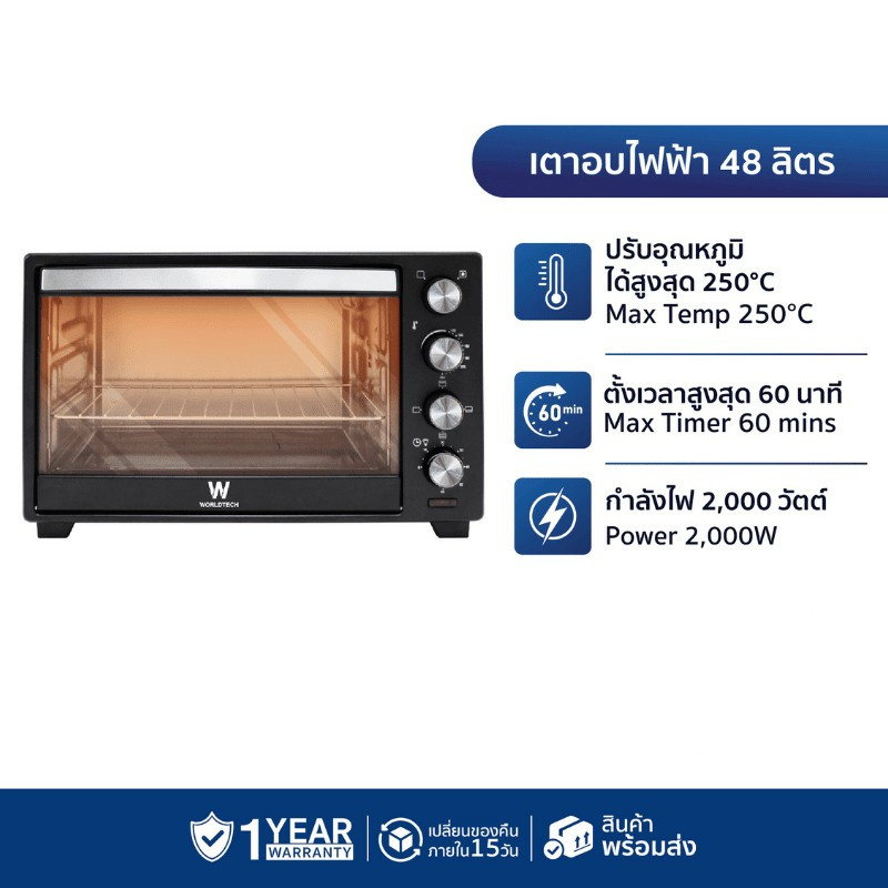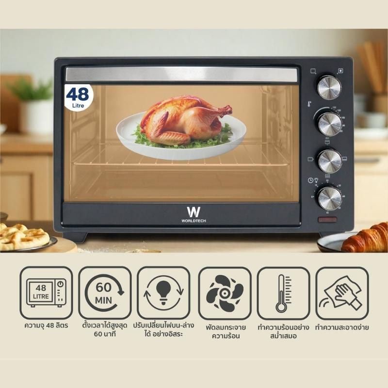 - ความจุใหญ่ 48 ลิตร รองรับเมนูอบไก่ทั้งตัว, พิซซ่า, ขนมเค้ก ฯลฯ
