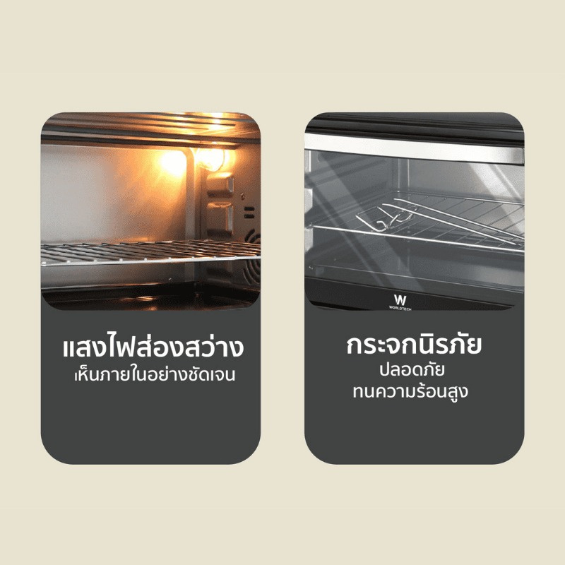 - กระจกนิรภัย + ไฟส่องสว่าง เห็นอาหารชัดเจน ปลอดภัย