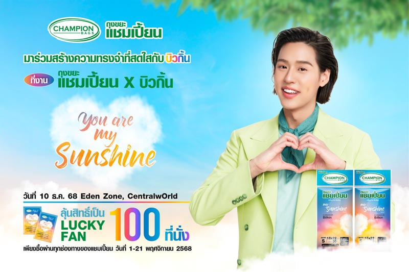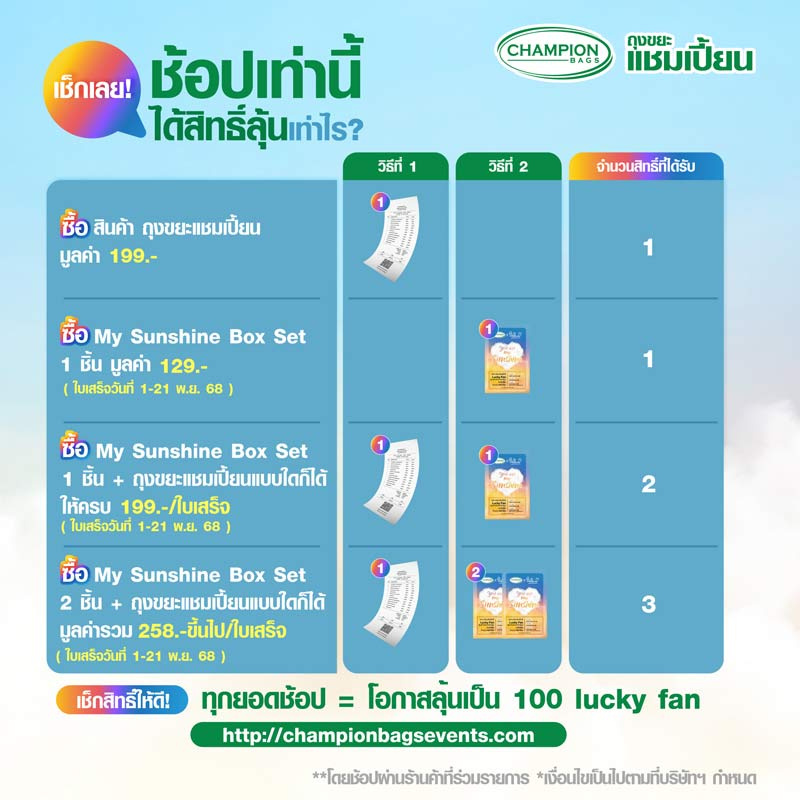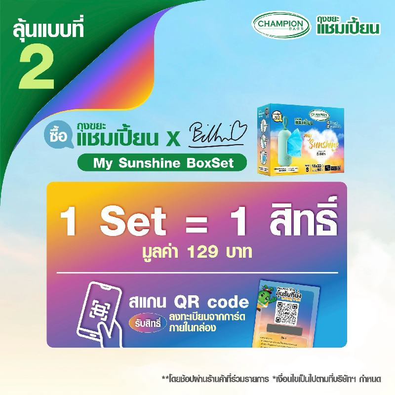 ** Champion Bags x Billkin My Sunshine Box Set = รับ 1 สิทธิ์ (สแกน QR Code ในการ์ด เพื่อลงทะเบียนรับสิทธิ์ลุ้นร่วมกิจกรรม)