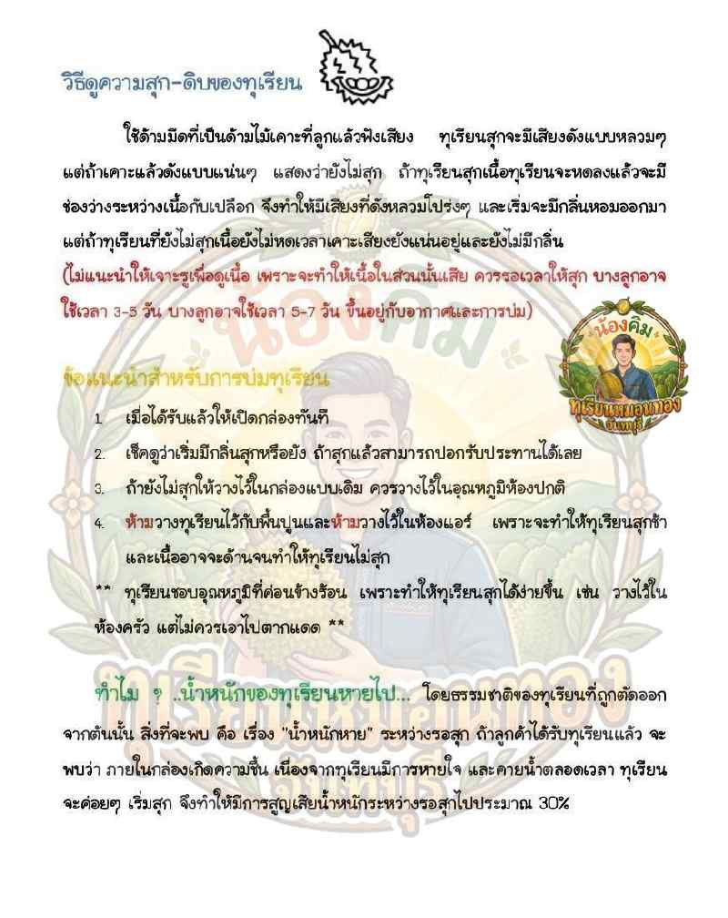 2. ทุเรียนสุกเกินไป จะพิจารณาจากวันที่จัดส่งถึงลูกค้า และวันที่ลูกค้าปอก