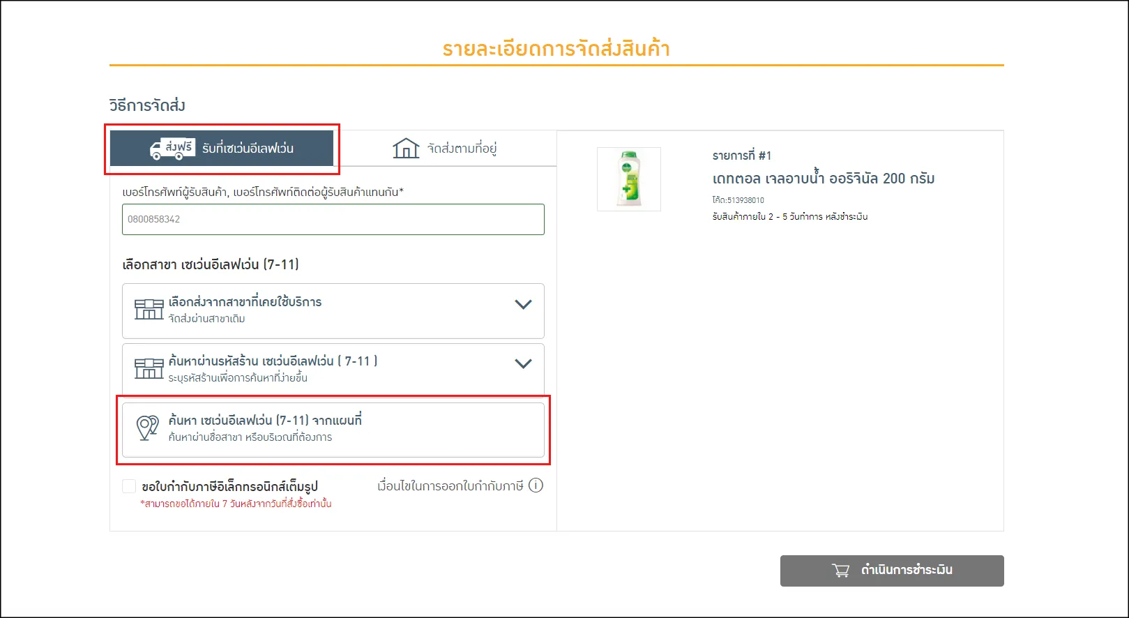 เมื่อช้อปสินค้าออนไลน์ผ่านเว็บไซต์ “ALL ONLINE ห้างใกล้บ้าน” สามารถเลือกรับสินค้าที่ร้านเซเว่นอีเลฟเว่น ฟรี! ไม่มีค่าใช้จ่าย โดยเมื่อสั่งซื้อสินค้าเรียบร้อยแล้ว เลือกวิธีจัดส่งเป็นร้านเซเว่นอีเลฟเว่น ตามขั้นตอน